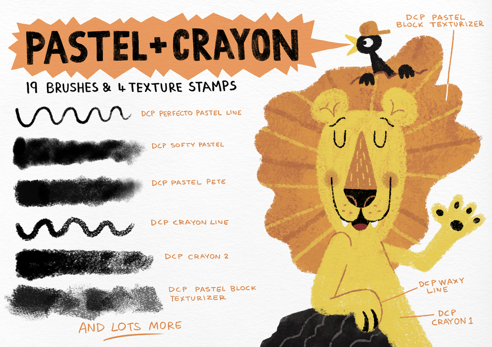 Draw or add texture with these pastel and crayon inspired brushes. Includes brushes for linework and for filling in large areas.